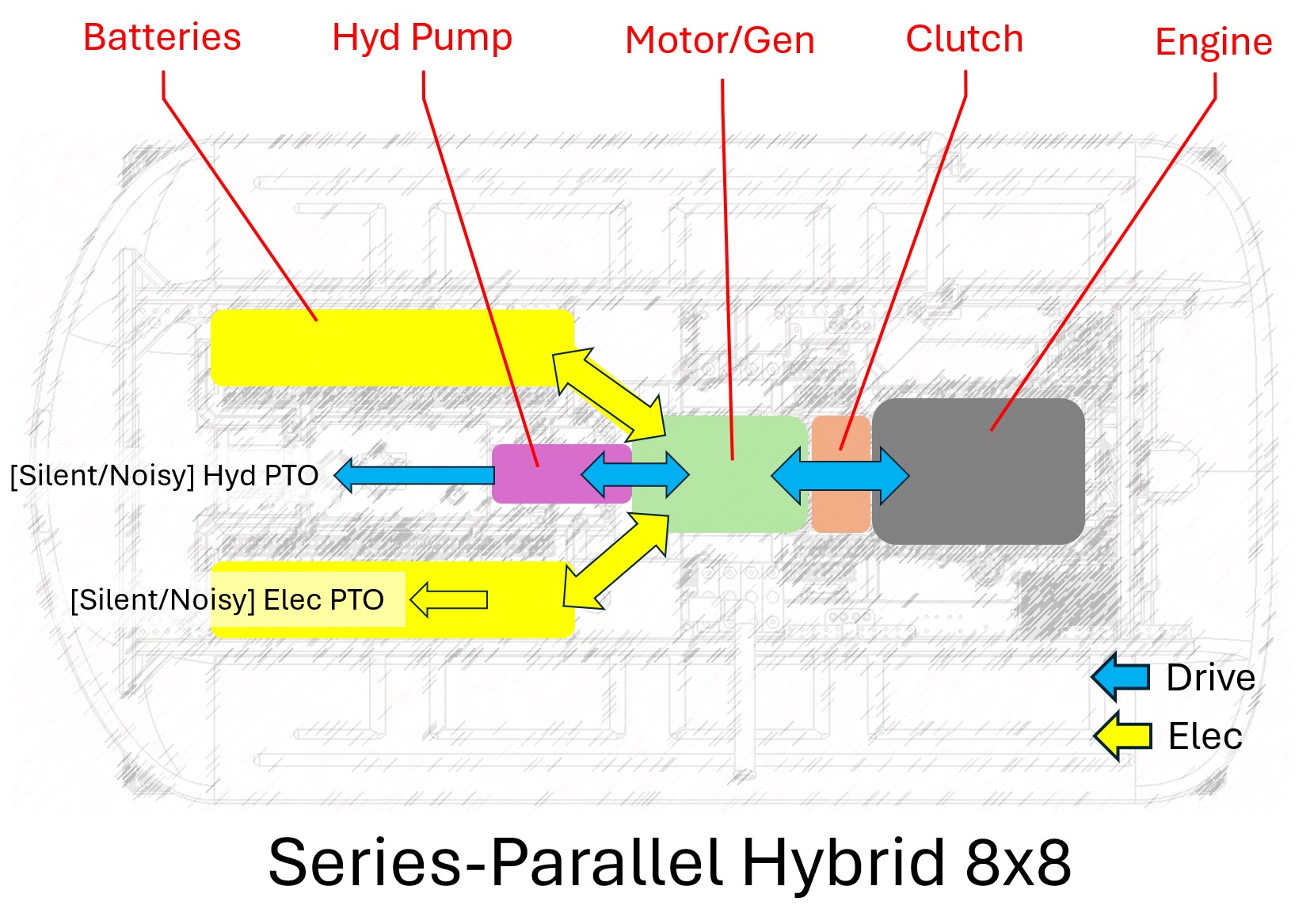 Series-Parallel Hybrid 8×8 – Engine driving through clutched electric motor into hydraulic system; the gold standard in our view, offering uncompromised performance with ICE and electric drive operating either separately or in combination. Precision, power and robustness of our existing hydraulic drive and controls plus important features such as engine braking and recharging on the move. This solution potentially exceeds all aspects of current Proteus performance, with key enhancements such as silent running (100km+) and silent zero-emissions external power supply (20kWh) and only a minor sacrifice of onboard load capacity (down to about 2000kg). Options for 20 or 40 kWh onboard battery storage.